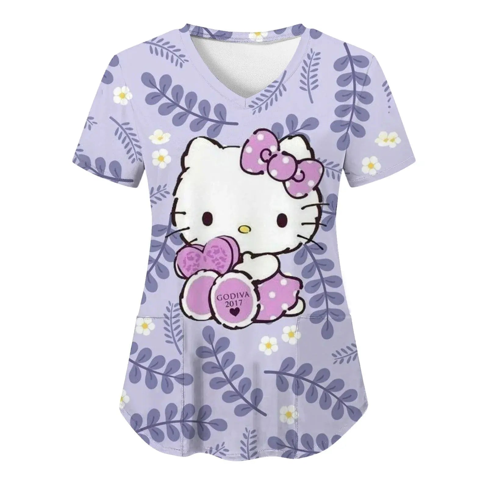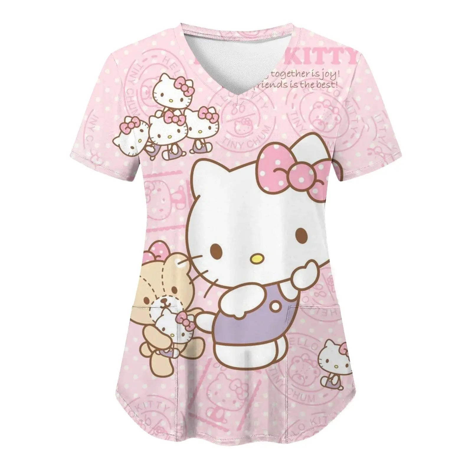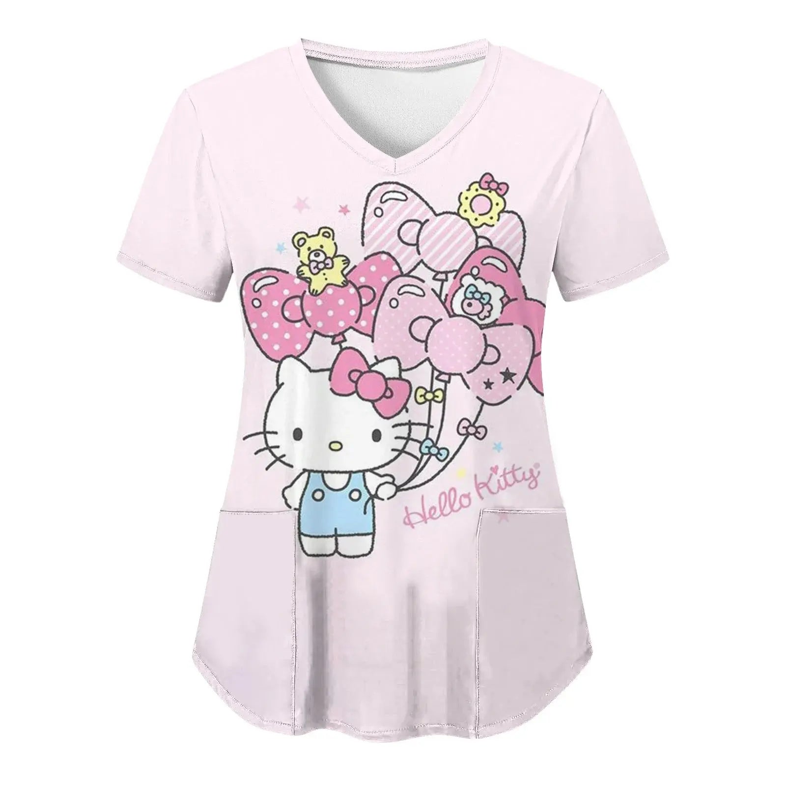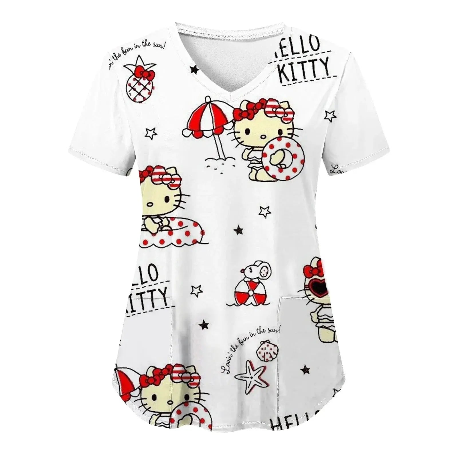Bringen Sie Freude und Komfort in Ihren Alltag: Dieses kurzärmelige Damenoberteil mit V-Ausschnitt und verschiedenen Hello Kitty-Aufdrucken im Cartoon-Stil eignet sich perfekt für Krankenschwestern, Ärzte oder legere Krankenhauskleidung.