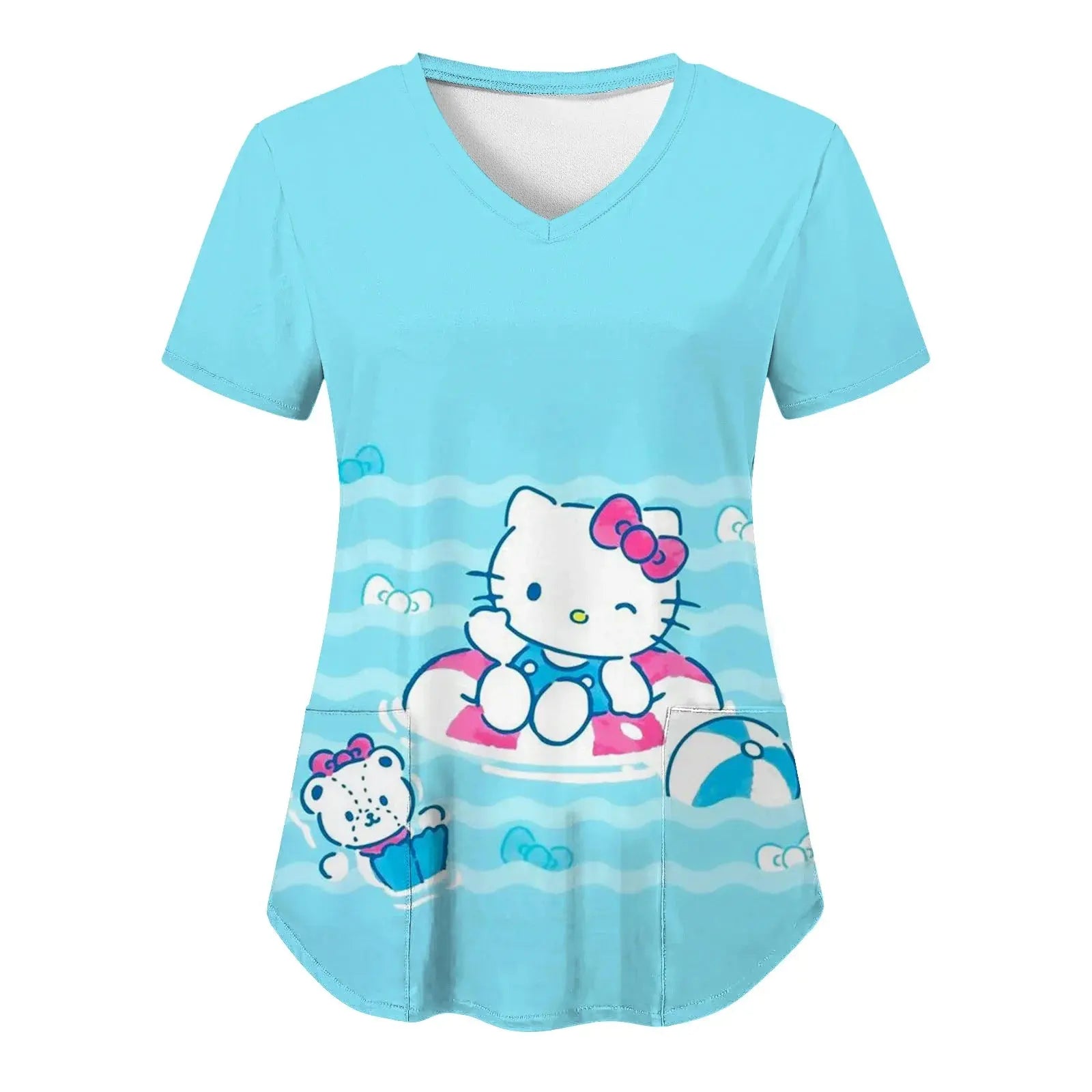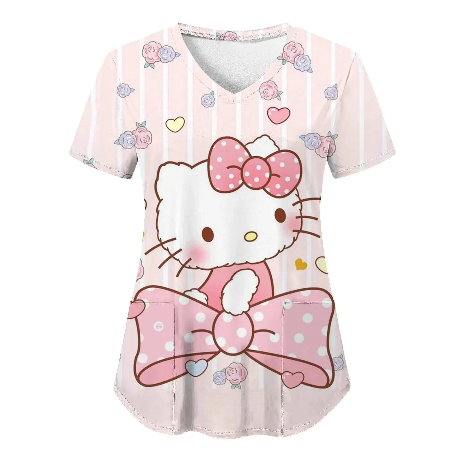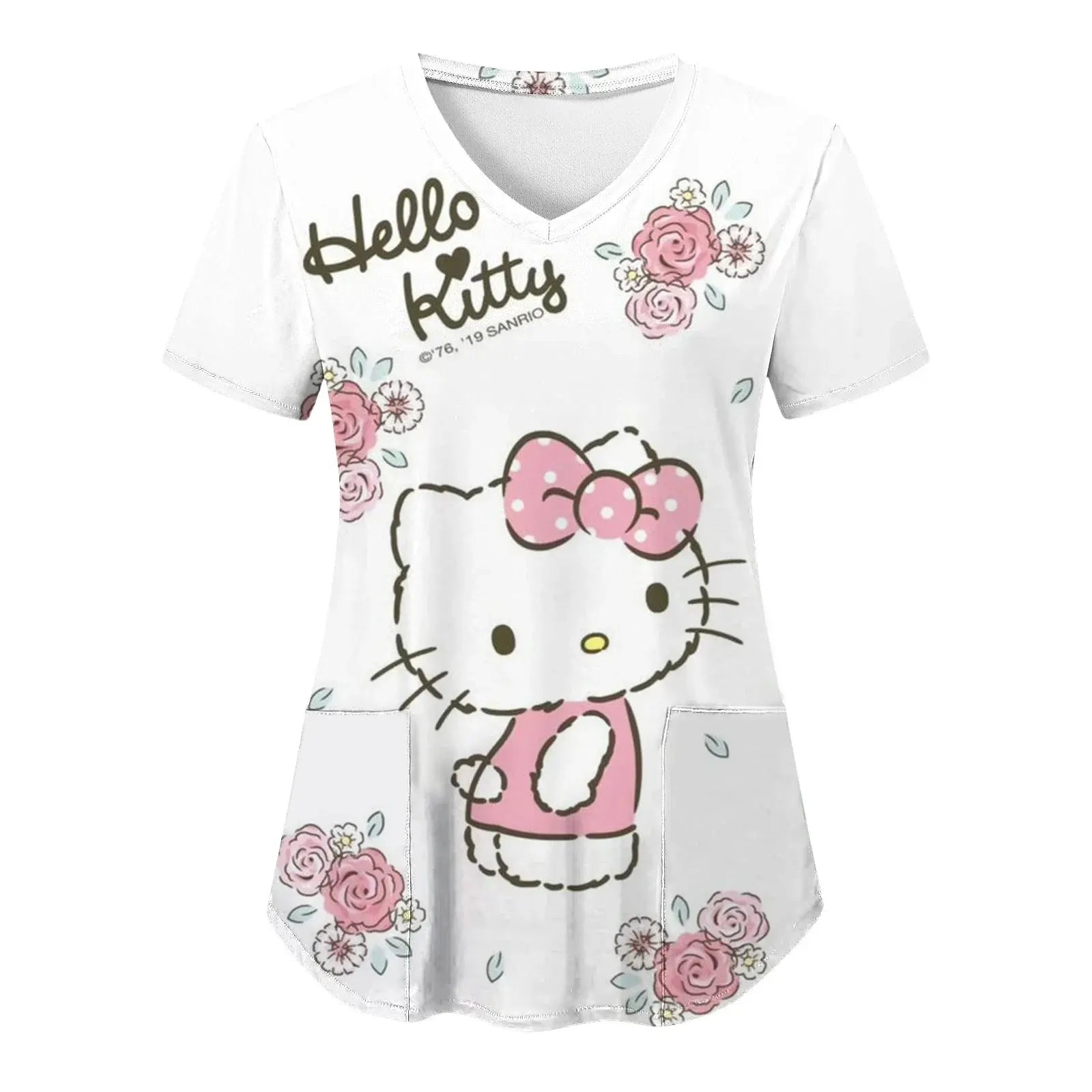 Bringen Sie Freude und Komfort in Ihren Alltag: Dieses kurzärmelige Damenoberteil mit V-Ausschnitt und verschiedenen Hello Kitty-Aufdrucken im Cartoon-Stil eignet sich perfekt für Krankenschwestern, Ärzte oder legere Krankenhauskleidung.