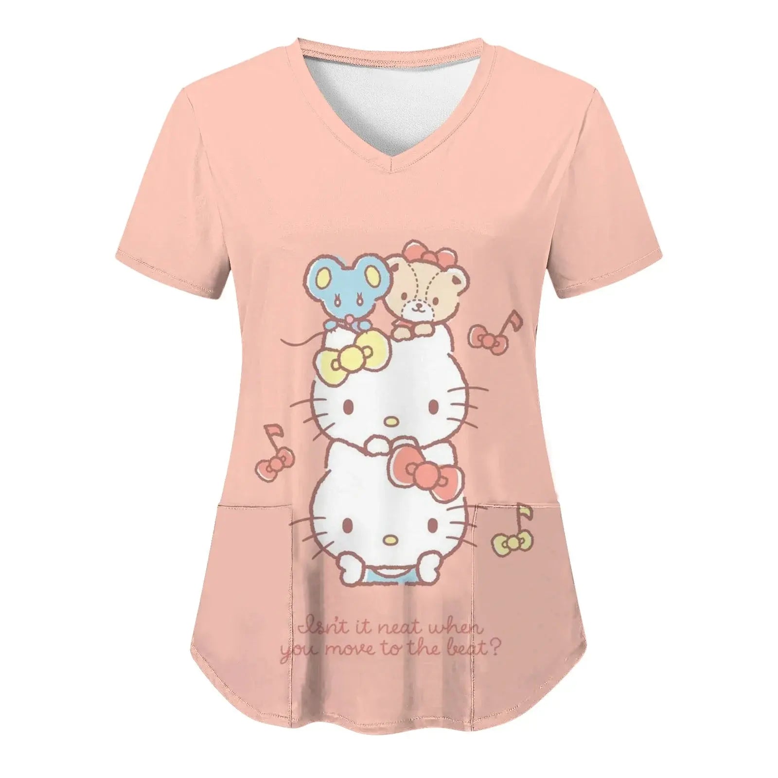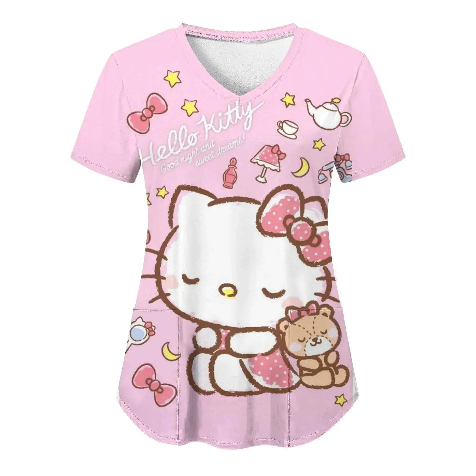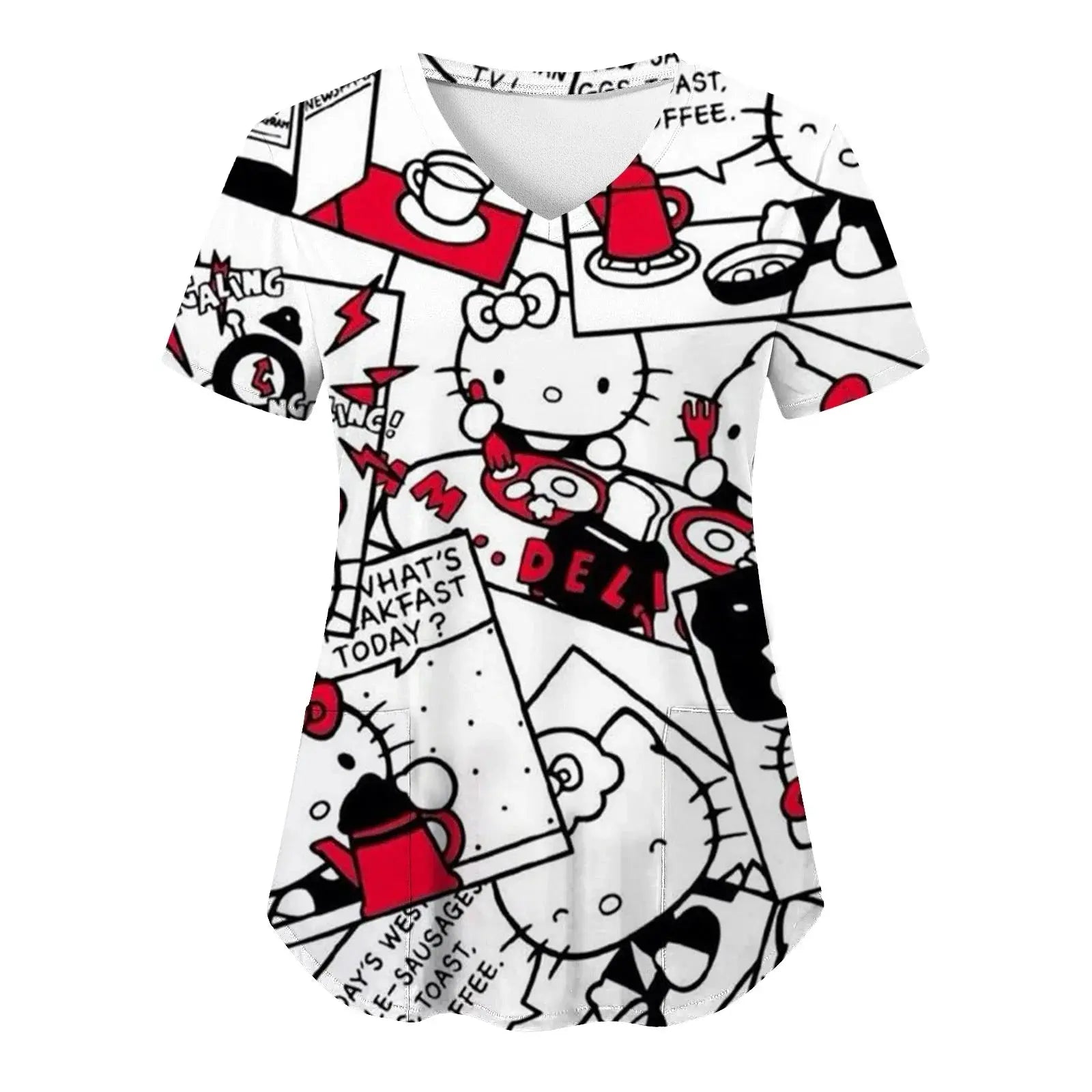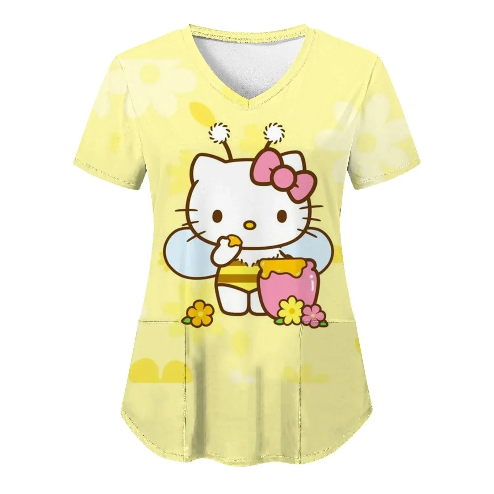 Bringen Sie Freude und Komfort in Ihren Alltag: Dieses kurzärmelige Damenoberteil mit V-Ausschnitt und verschiedenen Hello Kitty-Aufdrucken im Cartoon-Stil eignet sich perfekt für Krankenschwestern, Ärzte oder legere Krankenhauskleidung.